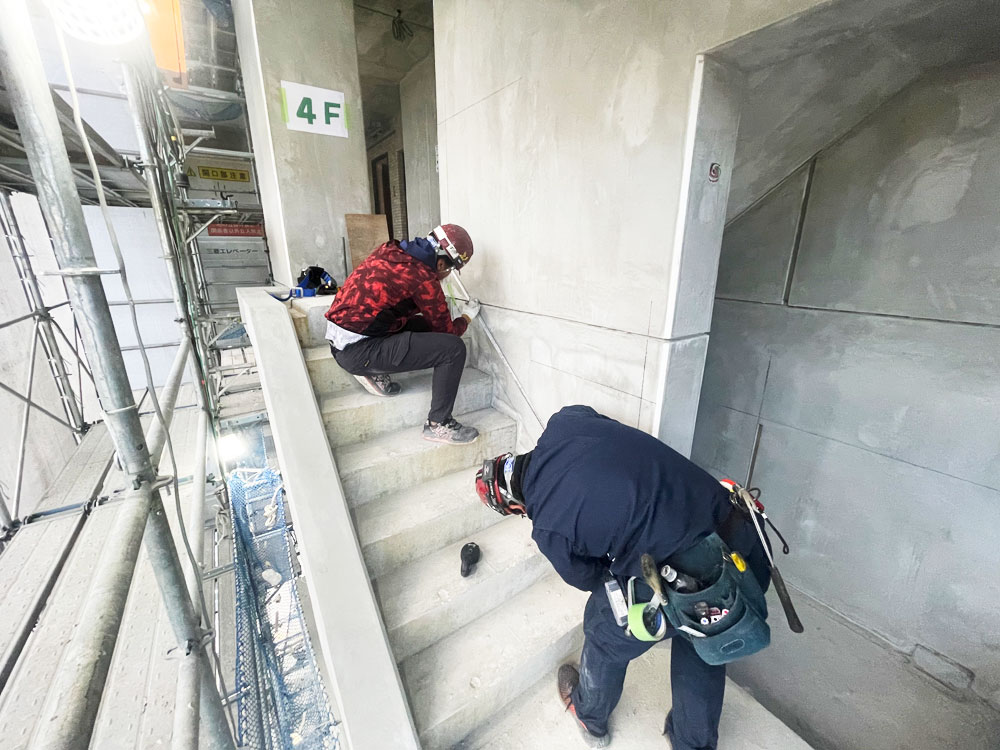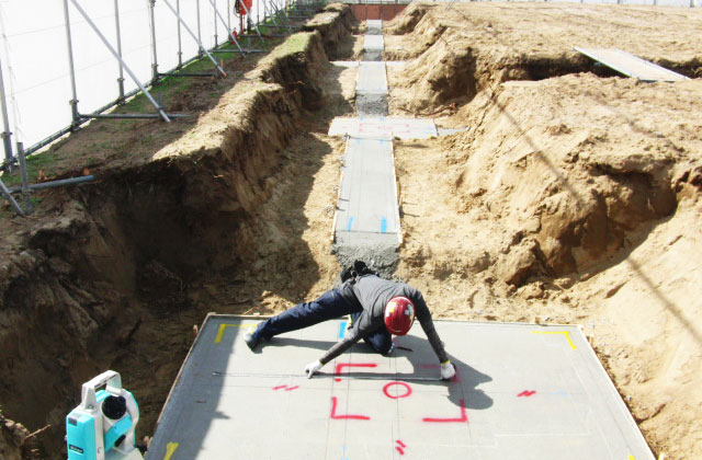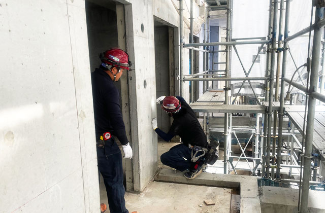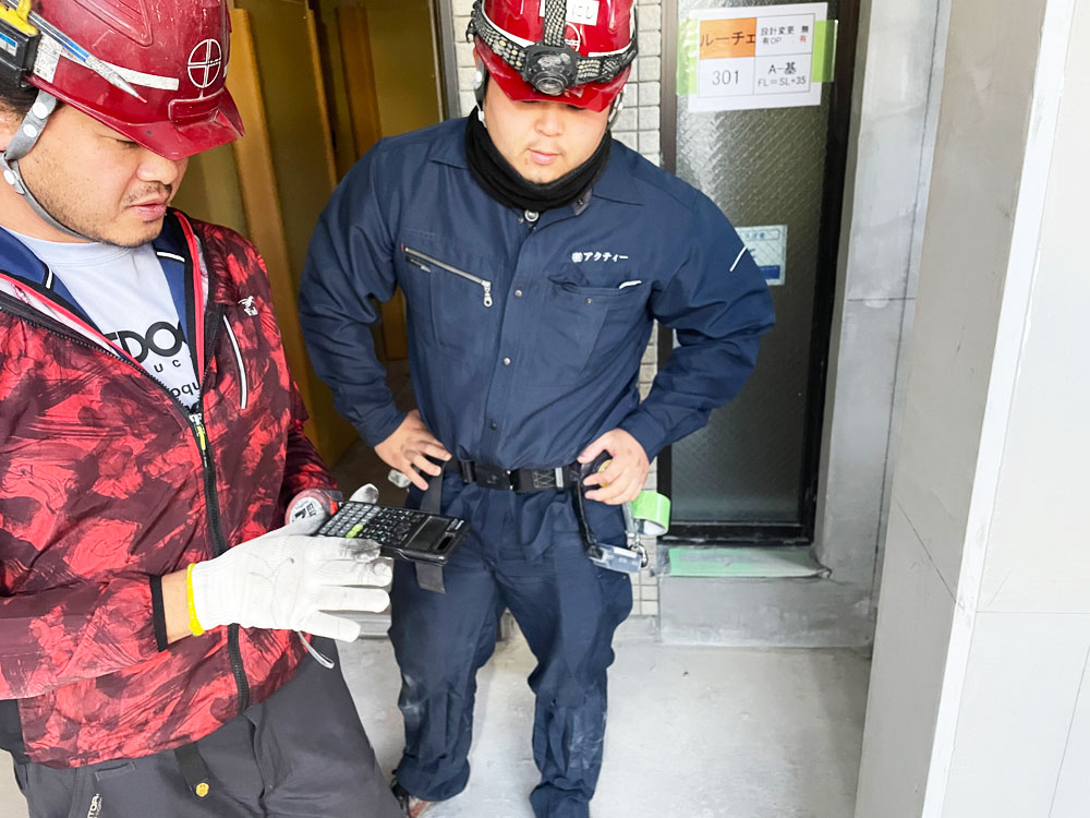 建築現場内で、建物の基準となる線(墨)を出す仕事を行っています。基本は2人1組での作業となりますので、先輩に付いてもらい仕事を確実に覚えていきましょう。大体の仕事の流れは、3ヶ月~半年くらいで身についていきます。